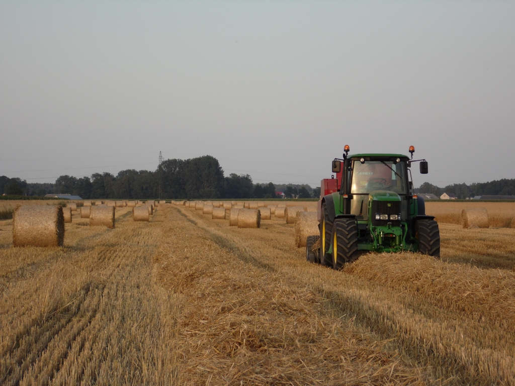 Zgniot ustawiony na 60% przy wyrzucaniu beli wskaźnik pokazywał międz 70 a 80%. W naszej ponad 5tys. zrobione. Wałek wytrzymuje. Sprzęgło puszcza jak się komora zakleszczy albo jakiś kamień na rotorze stanie. Belki dosyć gęsto ale fotka robiona ze zbliżeniem więc odległości też się trochę zmniejszyły . Ogólnie było 115 sztuk z ok 3.2ha.