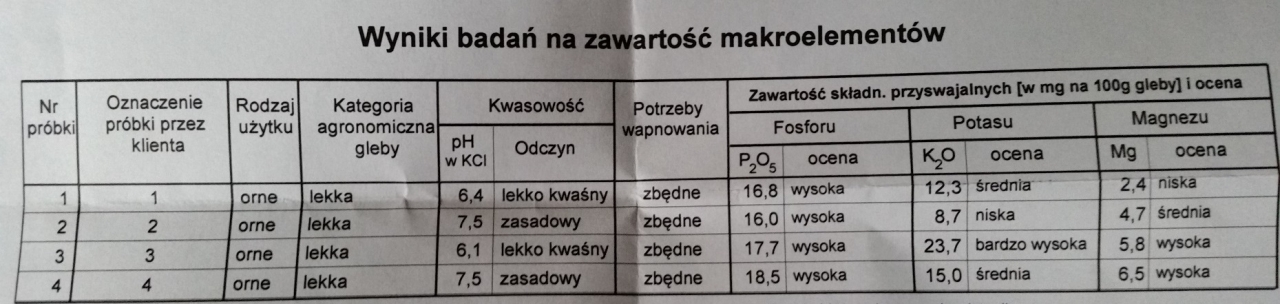 trzy pierwsze próbki to 15 letnia dzierżawa a ostatnia to własna dzierżawa wapnowana w 2012r 2.5t/ha wapno węglanowe magnezowe typ 03 (dolomit) i w 2014 1,5t/ha wapnem kujawit 05, a działka własna to będzie wapnowanie w 2010r 2.5t i w 2014 też 2.5t tym magnezowym