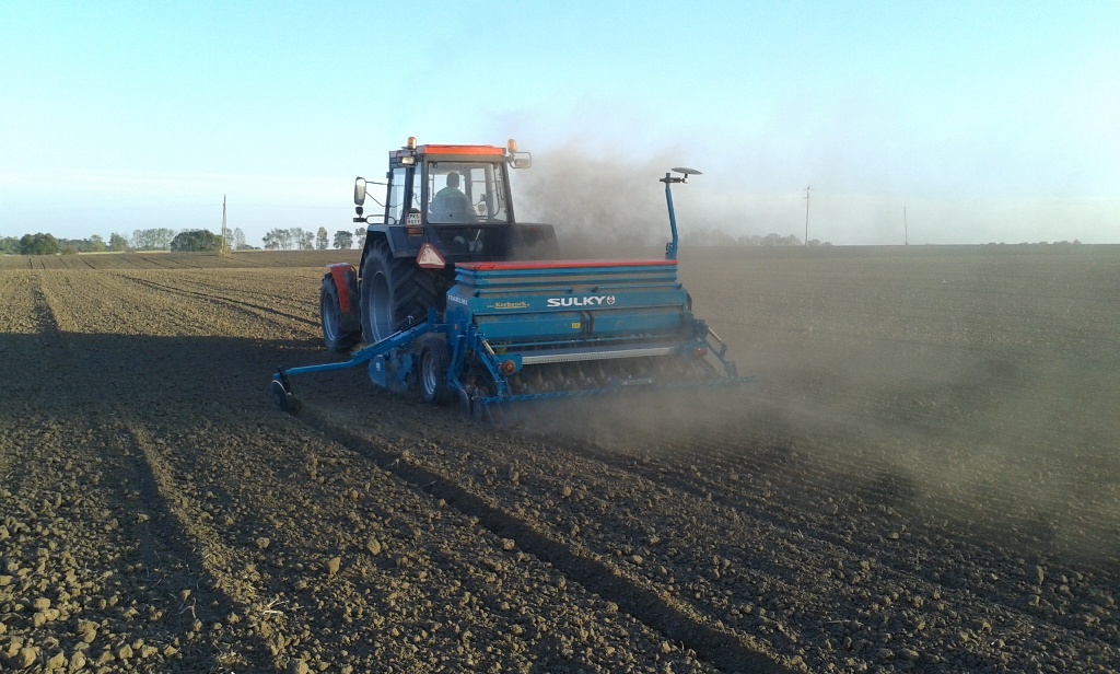 prędkość ok 8,5 km/h, obroty silnika 1700, wałek ustawiony na 1000. Tutaj akurat był pierwszy siew i ustawienia i widać delikatne ślady pomiędzy przejazdami, które zostały już wyeliminowane