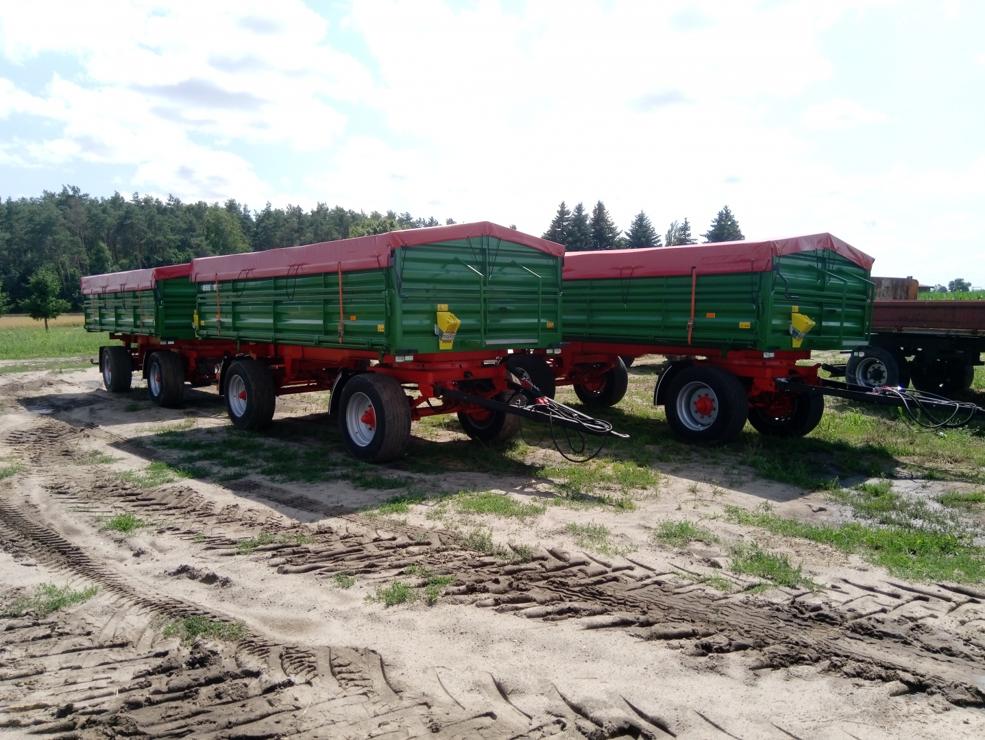 Przyczepy to mieliśmy już z 10 lat, stały tam na drugim gospodarstwie. One miały drewniane burty, opony balonówki te większe to tym wozić strach było. A się okazało, że ten co Jockerfarmom robi te przyczepy jest z tamtych okolic, więc ojciec pojechał, się dogadał, zrobili i są. Jedne już w lutym były zrobione, ale nie było kiedy odebrać i tak stały. To za te 46 tyś, a teraz robił dwie pozostałe to 56 tyś. Ze starych przyczep zostały ramy, osie i tłoki, ale są po regeneracji. Reszta wszystko nowe.