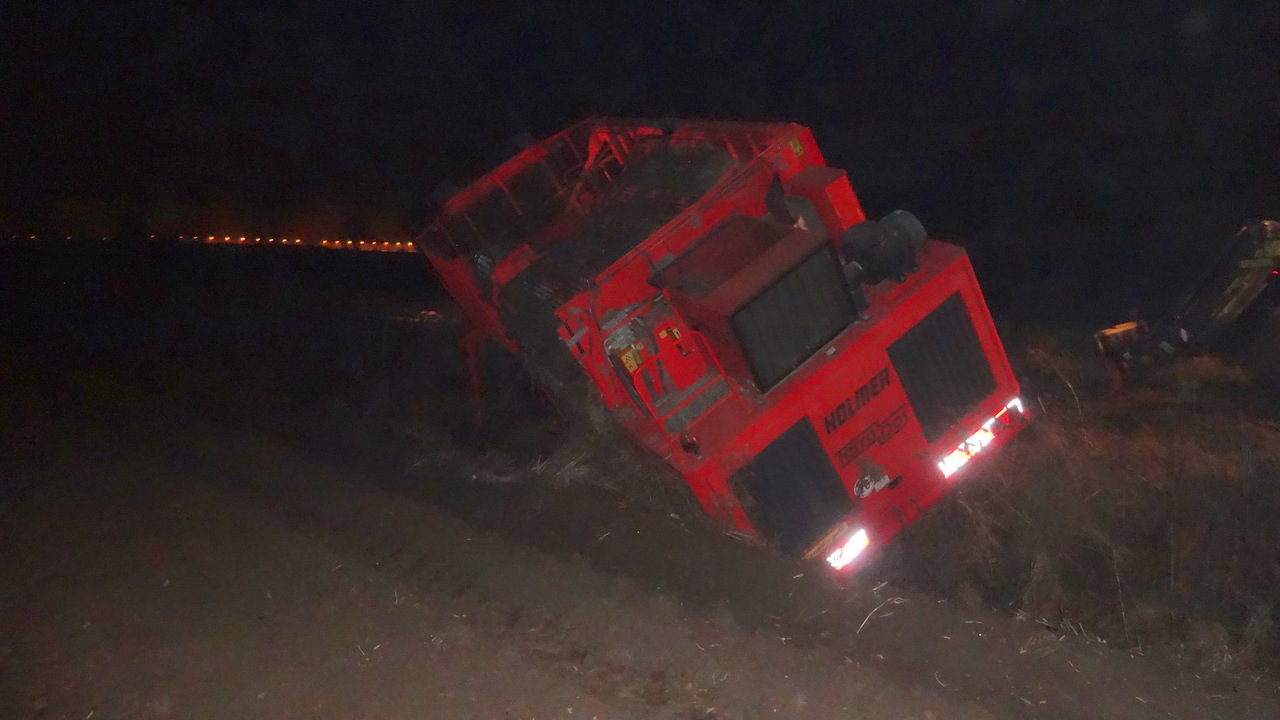 ciężko powiedzieć co bezposrednio było przyczyną, 1 sprawa wąska droga która jest takiej samej szerokości co holmer po oby stronach głębokie rowy co przy ruchu kierownicy mogło spowodować to co widac, kolejną przyczyną może być zmęczenie operatora po tylu godzinach przesiedzianych za kierownicą, kolejną przyczyną noc