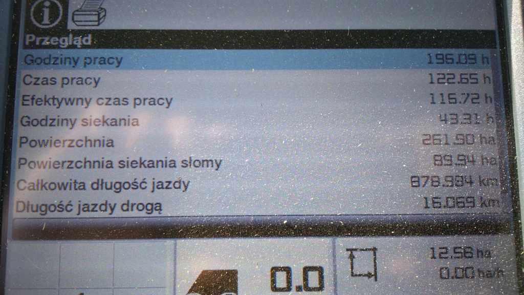 Efektywny czas pracy to praca z włączonym przyrządem żniwnym podczas jazdy ,czyli 116h Czas pracy 122h to praca młocarni-zbiór+sypanie na postoju. Reasumując średnia z całości 2,1ha\h Na dobrym polu 22-24t pszenicy zrobi.