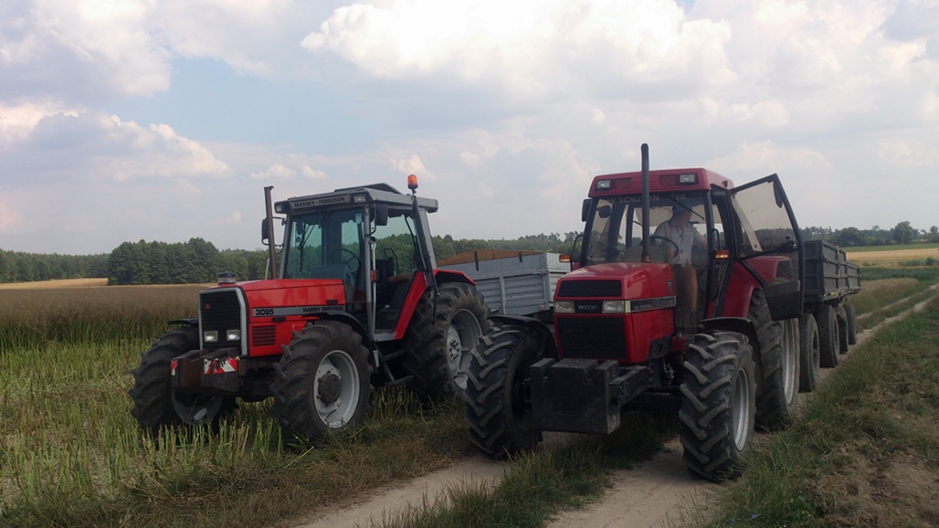 Dwa razy tak jechaliśmy w piątek i sobotę. W piątek Case ciągnął jedną Autosankę a MF dwie, a w sobotę oba ciągły po dwie. Czy ja wiem czy lepiej większe do MF-a? Nie ma za bardzo różnicy w mocy, Case ma Dynashifta do transportu lepiej i jest wolniejszy więc nie czuje tak tego ciężaru, a i nie jest też wiele cięższe, bo ta druga jest mniejsza od moich. Case pojechał do Stradomi, a MF latał po polach